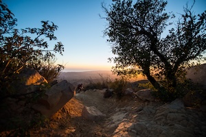 We decide to push on. The trail drops into a steep drainage. The shadows loom heavy where the sun’s fading light can’t reach. Through the dry creekbed, we ride over the tumbled boulders of last year’s rains. Up the other side, our reward awaits just out of view. We float down a swift flowing descent that dissolves the world into a dizzy joy.